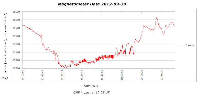 The CME impact of the 30th was felt by my magnetometer. The graph shows the y axis displacement, and while they are obvious on the graph chances are, from Ireland any low level aurora would be wash out by the harvest Moon.